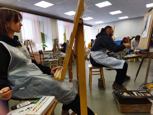 На мастер-класс к Андрею Селенину собрались ребята 12-14 лет. Поскольку опыта работы масляными красками у них не было, художник предложил написать классический натюрморт с кувшином. Селенин, как выяснилось, наш земляк. Жил в Мурманске до 10 лет, а потом переехал с родителями в Керчь. Когда ему сказали, что есть возможность поехать на Север – сразу согласился. Питерский художник отметил, что для юных художников в городе созданы прекрасные условия: мастерские большие, в помещениях много света. Такое в столицах не везде увидишь, не говоря о небольших городах.