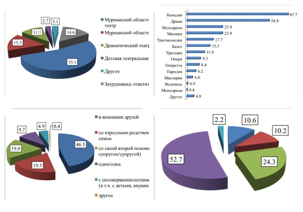 Большинство респондентов (92,0%) живут в Мурманске. Они ходят на спектакли, как правило, с друзьями или подругами (46,5%). О премьерах узнают на официальном сайте театра, и приобретают билеты онлайн (50%).