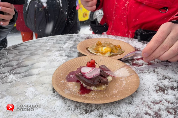 «В Мурманске нам очень нравится, вот, единственное, погода нас сегодня испытывает. В снегопад, конечно, тяжело, особенно людям, которые стоят, ждут и будут есть еду со снегом. Но в первые дни было солнышко, правда очень холодно. Но мы подготовленные! Мы, видите, в валенках, у нас есть термогрелки. Очень красиво в Териберке. Мы погуляли по городу, попробовали еду. Ребята очень впечатлены и сейчас свои все впечатления от этой поездки они вложат в блюда, которые готовят», — прокомментировала Большому Радио режиссёр проекта Анна Маркарян.