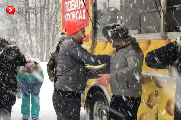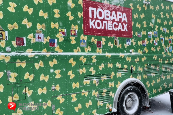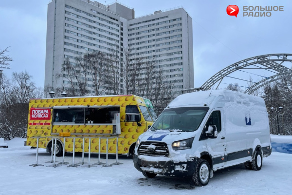 Как рассказал Большому Радио один из членов съемочной группы, движок и база у поварского фудтрака взяты от КАМАЗа! А кузов был специально сделан под заказ в Америке. Такому зверю точно не страшно бездорожье и плохая погода, которая сегодня потрепала нервы съемочной группе. То и дело приходилось убирать снег с экрана над окошком раздачи, столиков для посетителей и самих поваров! Северяне же наоборот шутили и не обращали внимание на снег, летящий со всех сторон.