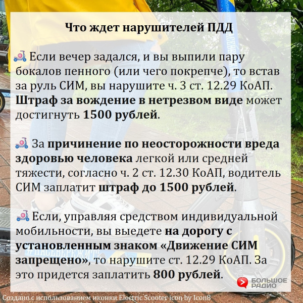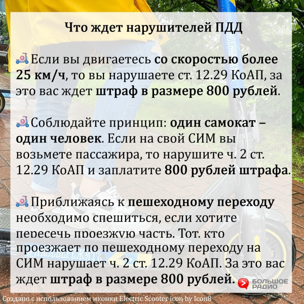 — Соблюдайте принцип: один самокат – один человек. Если на свой СИМ вы возьмете пассажира, то нарушите ч. 2 ст. 12.29 КоАП и заплатите 800 рублей штрафа.