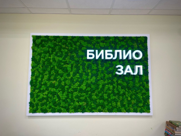 На территории всей библиотеки привлекают внимание панно из стабилизированного мха - островки буйной зелени на стенах.