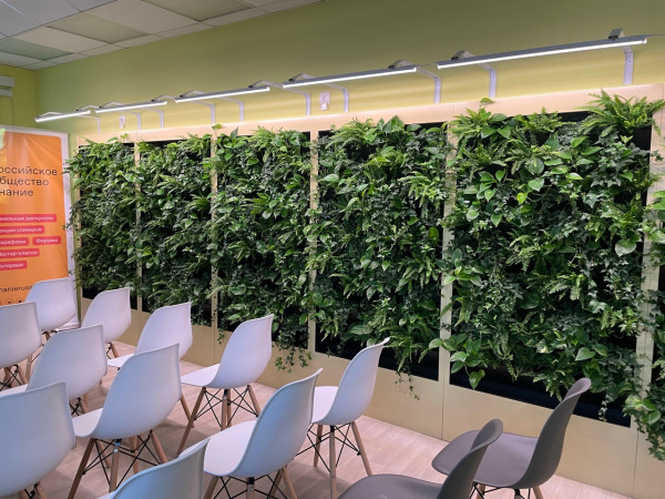 Фитостена оснащена искусственным освещением и автоматической системой полива, чтобы конструкция надолго сохранила свой свежий вид.