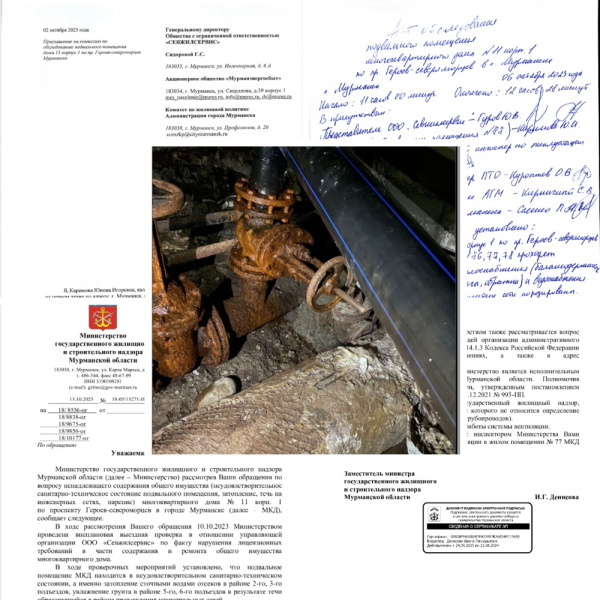 Из коллективного обращения: «… совместно с заместителем директора ООО «Севжилсервис» Гуровым Ю.В. установлены протечка канализационных стояков, наличие отходов жизнедеятельности, сырости и зловонных испарений… и на стенах конденсат и плесень. Система вентиляции в виде продухов не установлена точечно. В подвальном помещении присутствует строительный мусор, грызуны и насекомые… Пользование общим домовым имуществом невозможно, скопление паров и неприятный запах создаёт угрозу здоровью…»