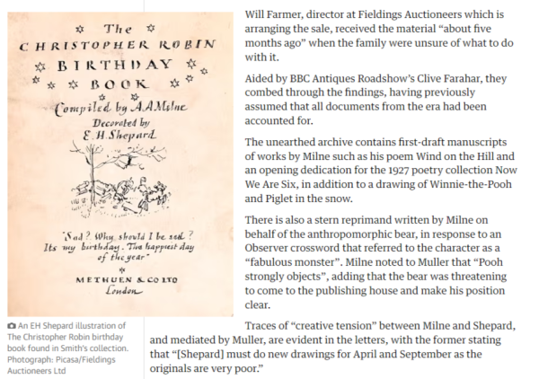 Кроме того, в архиве была найдена книжка с иллюстрациями для сына писателя, Кристофера Робина, которую Милн с Шепардом создали специально для мальчика в честь дня рождения. Еще одна любопытная находка: записка, написанная Милном от имени медвежонка. Пух возмущается, что в кроссворде газеты Observer его имя было зашифровано подсказкой «сказочный монстр». Винни-Пух угрожает лично прийти в редакцию и разобраться с теми, кто ответственен за формулировку.