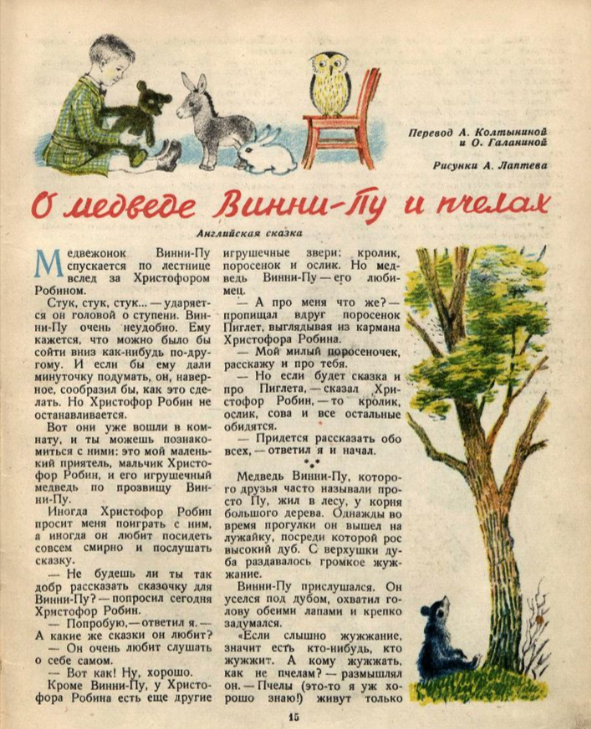 Интересно, что до перевода Заходера истории о мишке с опилками были опубликованы в 1939 году в журнале «Мурзилка»: первые две главы повести Милна перевели А. Колтынин и О. Галанина. Имя автора редакторы не указали, но оставили подзаголовок: «Английская сказка». В этом переводе героев называли Винни-Пу, Пиглет и Христофор Робин.