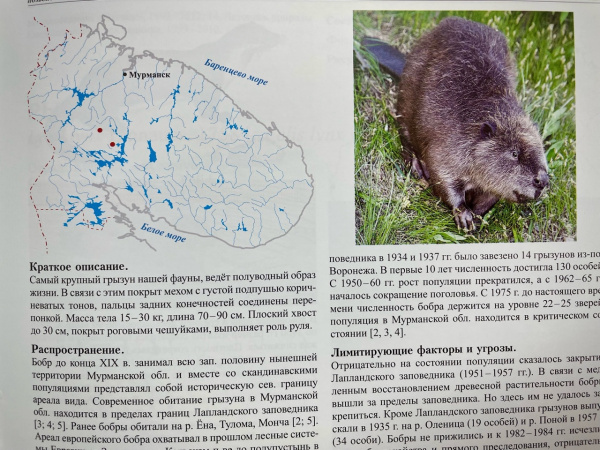Полуводное млекопитающее отряда грызунов, один из двух современных представителей семейства бобровых. Самый крупный грызун в Мурманской области, обитает в пределах границ Лапландского заповедника (р. Купись), на системе Куцколь-Воронья (севернее заповедника) и долины р. Яурийоки (западнее заказника «Лапландский лес»).