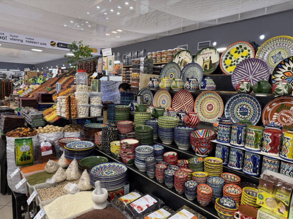 А после фруктов - отдел с молочной продукцией: каймак, творог, сыры местного производства. Мясной и рыбный отделы. Специи и сухофрукты. От количества и качества фермерской продукции кружит голову, и вот вы уже стоите с полными пакетами и широкой улыбкой. Здесь же, на базаре, можно купить гостинцы родным и близким – конечно, как-чак и казылык, сладкие тающие во рту пирамидки из масла и мёда и многое-многое другое. А из памятного – не наскучившие магнитики, а национальные тюбетейки. Или удивительно красивую посуду. Берёте много – не стесняйтесь торговаться! Восточный базар любит торг.