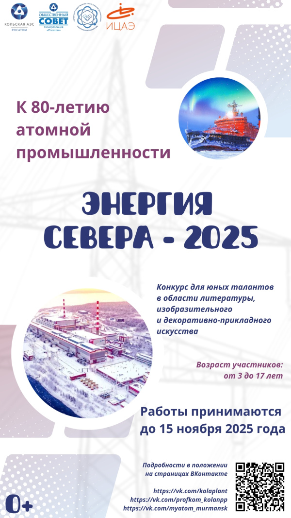 Творческое состязание пройдёт в трёх возрастных группах: для дошкольников (3-6 лет), детей (7-12 лет) и подростков (13-17 лет). Конкурсные работы принимаются до 15 ноября 2025 года. Финалистов ждёт торжественная церемония награждения в Информационном центре Кольской АЭС г. Полярные Зори, дипломы и памятные подарки.