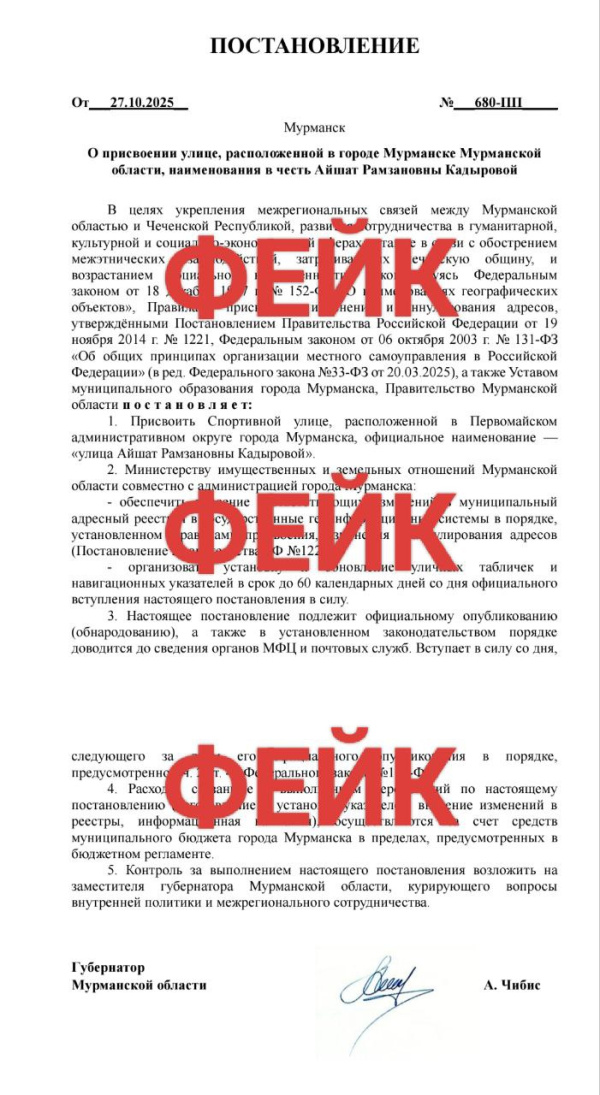 В соцсетях появилось поддельное постановление, якобы подписанное губернатором Мурманской области, о переименовании одной из улиц в Первомайском округе Мурманска.