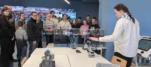 Для посетителей организовали экскурсию по зданию и учебным площадкам. Участникам показали классы, спортивные зоны, столовую, актовый и тренажёрный залы, а также современные лаборатории по естественным наукам. Особый интерес вызвали технопарк с оборудованием виртуальной реальности, площадки для 3D-моделирования и судомоделирования, а также лаборатории подводной робототехники. Школьники даже смогли попробовать себя в управлении роботами и промышленными манипуляторами.