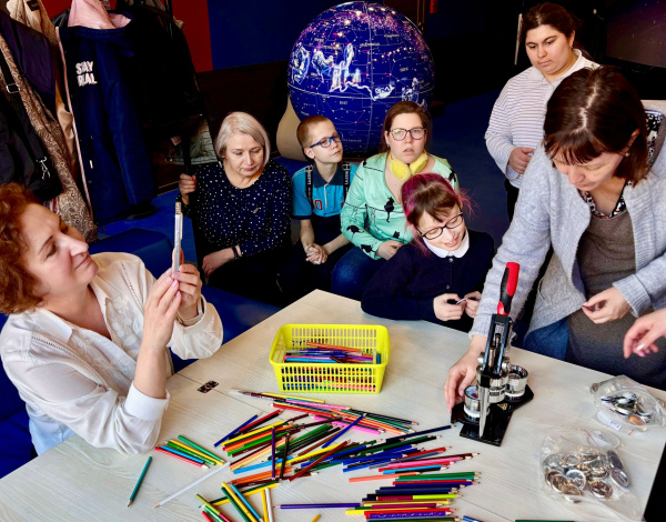 Воспитанники Мурманской областной специальной библиотеки для слепых и слабовидящих приняли участие в познавательной программе «Здравствуй, космос!» и посетили планетарий «Просто космос». Сначала для ребят провели мастер-класс. Под руководством сотрудника областной научной библиотеки Натальи Куряченко они освоили работу с прессом и изготовили значки с изображением любимых мультгероев.